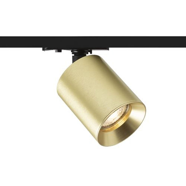 Cilindrična svjetiljka za jednokružnu traku za LED žarulju s bazom GU10, uključujući metalni ukrasni krug u boji brušenog mesinga. Zbog mogućnosti promjene boje moguće je kupiti krug u crnoj ili bijeloj boji.