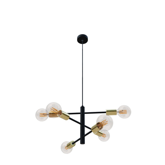 Dizajnerska viseća svjetiljka s ukrasnim mjedenim oblogama grla. Oblik svjetiljke se može prilagoditi pomicanjem krakova duž horizontalne osi. Prikladna za LED izvore svjetla s E27 grlom.