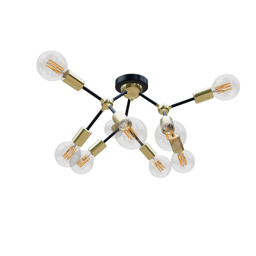 Stropna svjetiljka dizajnerskog izgleda s ukrasnim mjedenim poklopcima grla. Prikladna za LED izvore svjetla s E27 grlom.