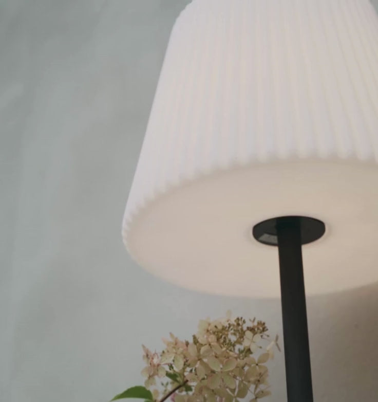 Podna svjetiljka s plastičnim sjenilom. Uključuje kabel s utikačem iz sigurnosnih razloga.