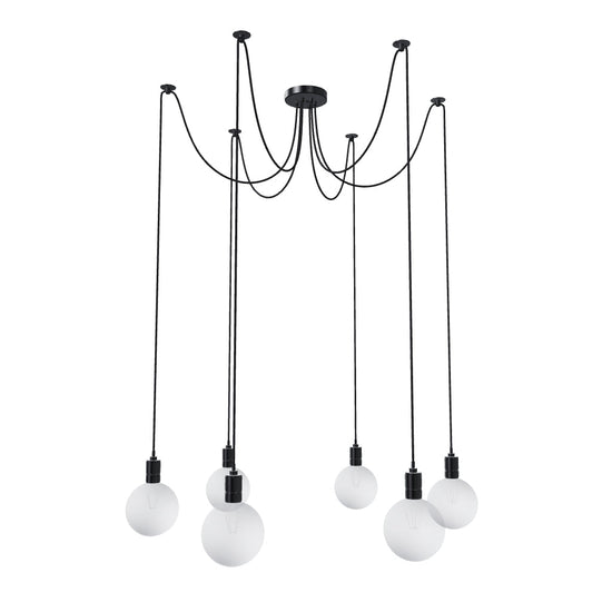 Viseća svjetiljka s centralnom stropnom bazom i 6 grla E27. Kablovi su pričvršćeni za strop pojedinačno i slobodno. Duljina svakog kabela je 2m.