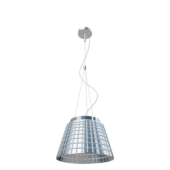 Viseća svjetiljka od čvrstog strukturiranog stakla. Staklo je kromirano s obje strane. Sjenilo je djelomično prozirno kad je svjetiljka uključena.