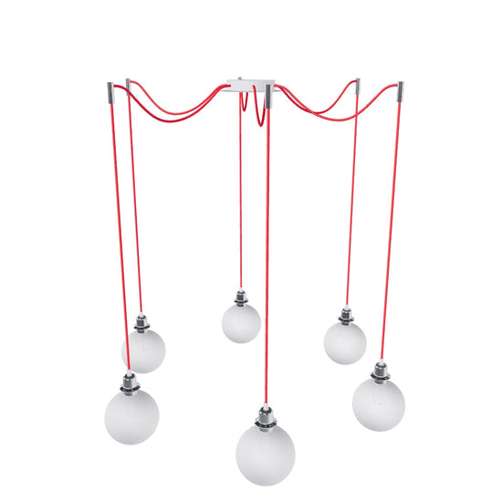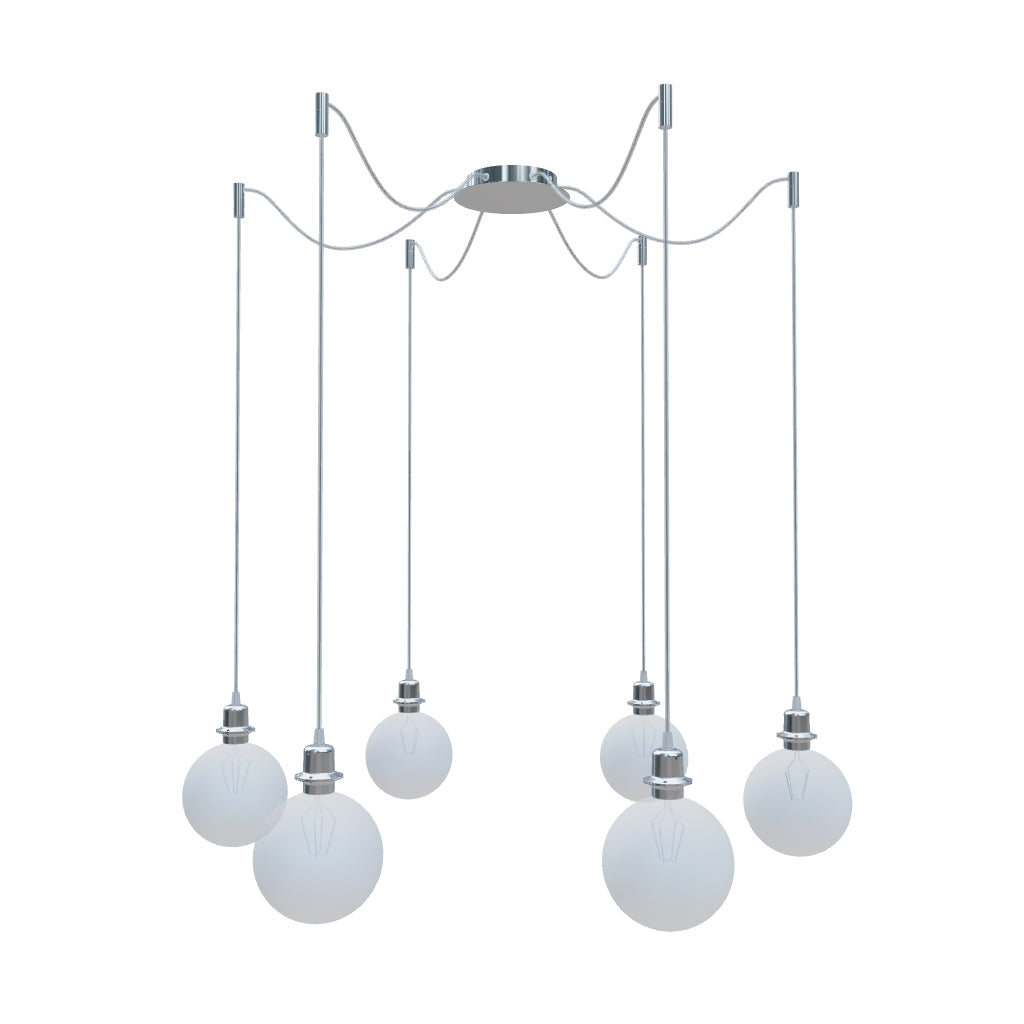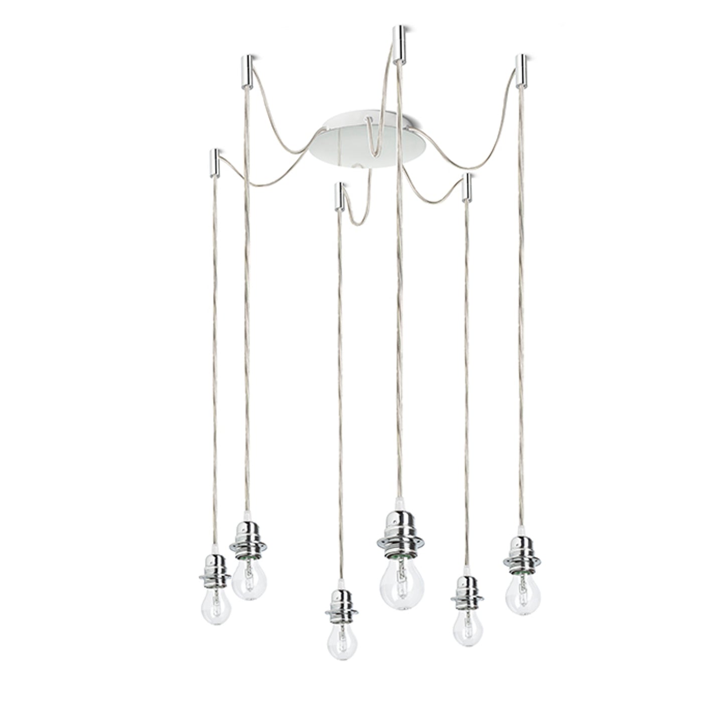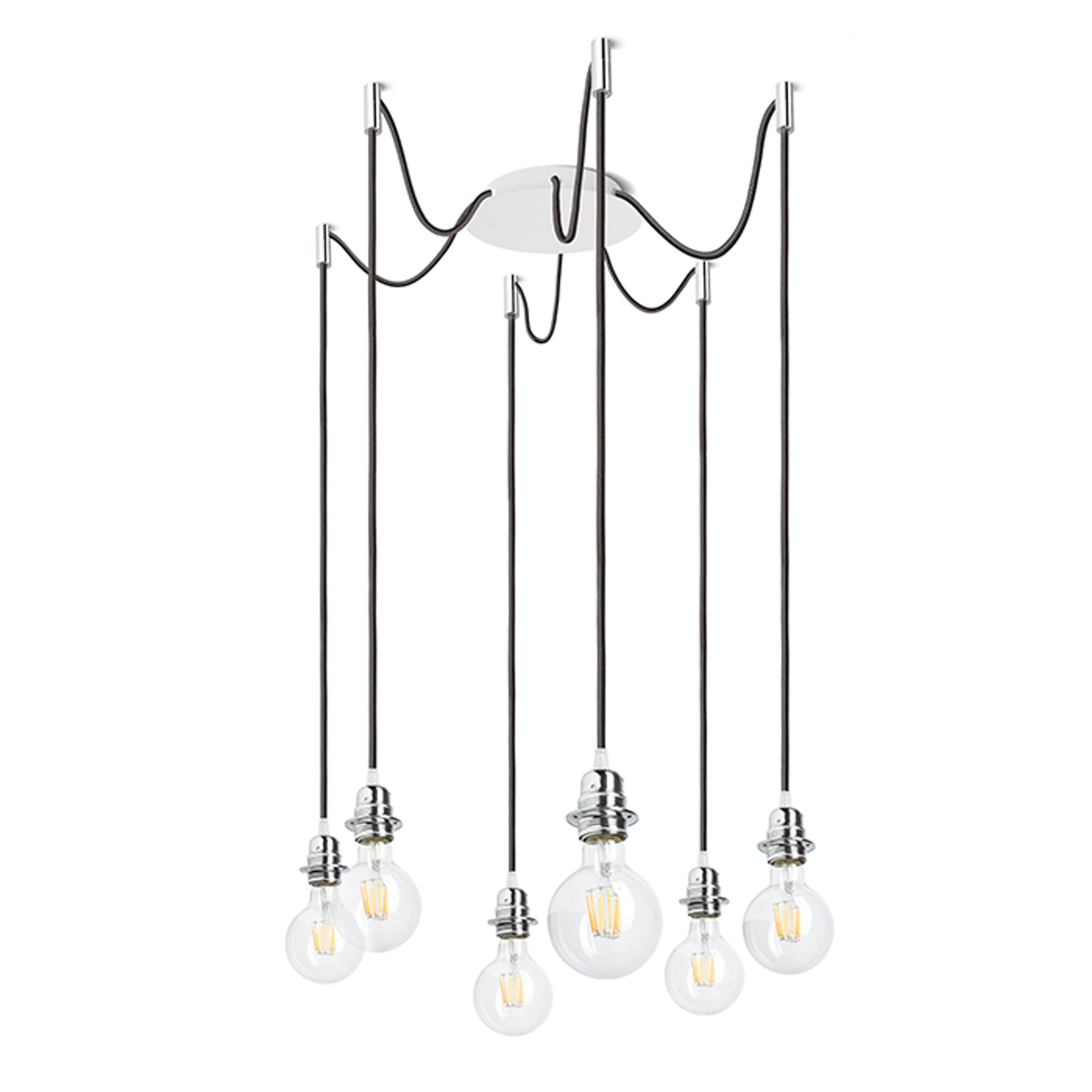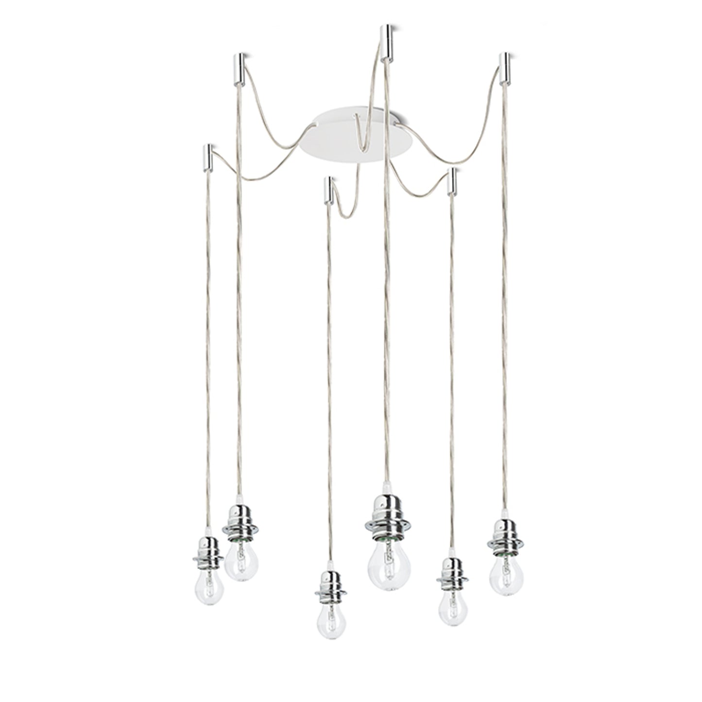 Viseća svjetiljka s centralnom stropnom bazom i pojedinačnim tekstilnim kabelima s metalnim grlom E27 za dekorativne žarulje ili pogodna tekstilna sjenila. Kabeli imaju krom stropne držače koji se mogu namjestiti na različite udaljenosti od baze. Svaki kabel ima 3m.