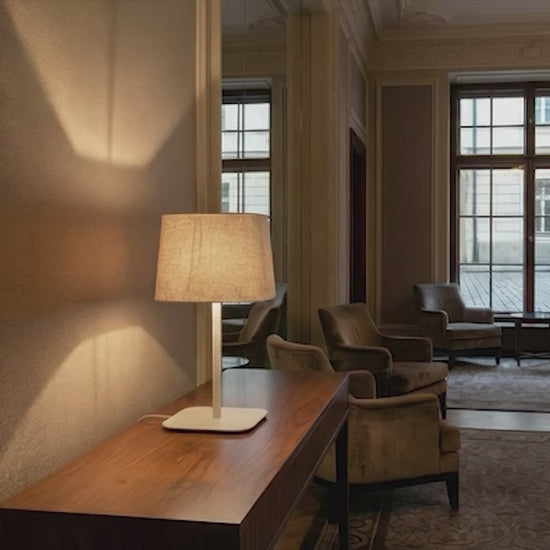 Stolna svjetiljka s četverokutnim tekstilnim sjenilom i metalnom bazom.